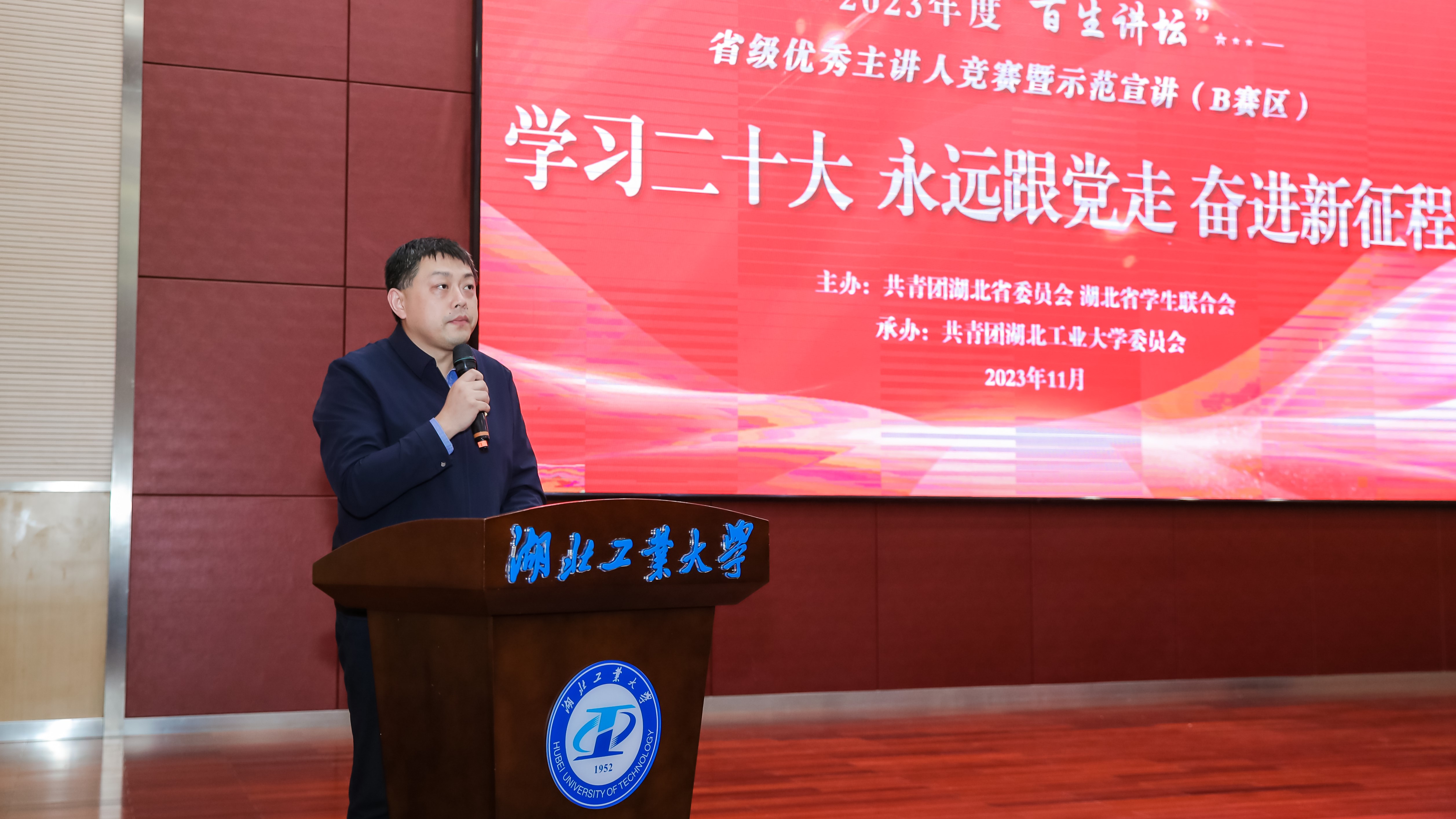 11月9日下午,由共青团湖北省委、湖北省学生联合会主办,学校团委承办的2023年度“百生讲坛”省级优秀主讲人竞赛暨示范宣讲(B赛区)在学校图书馆报告厅举行。团省委学校部黄冠、省学联驻会执行主席危雨阳、武汉科技大学马克思主义学院副院长刘勇、校团委书记李俊、校党委教师工作部副部长韩东以及各参赛高校团干部和青年学生代表参加了活动。