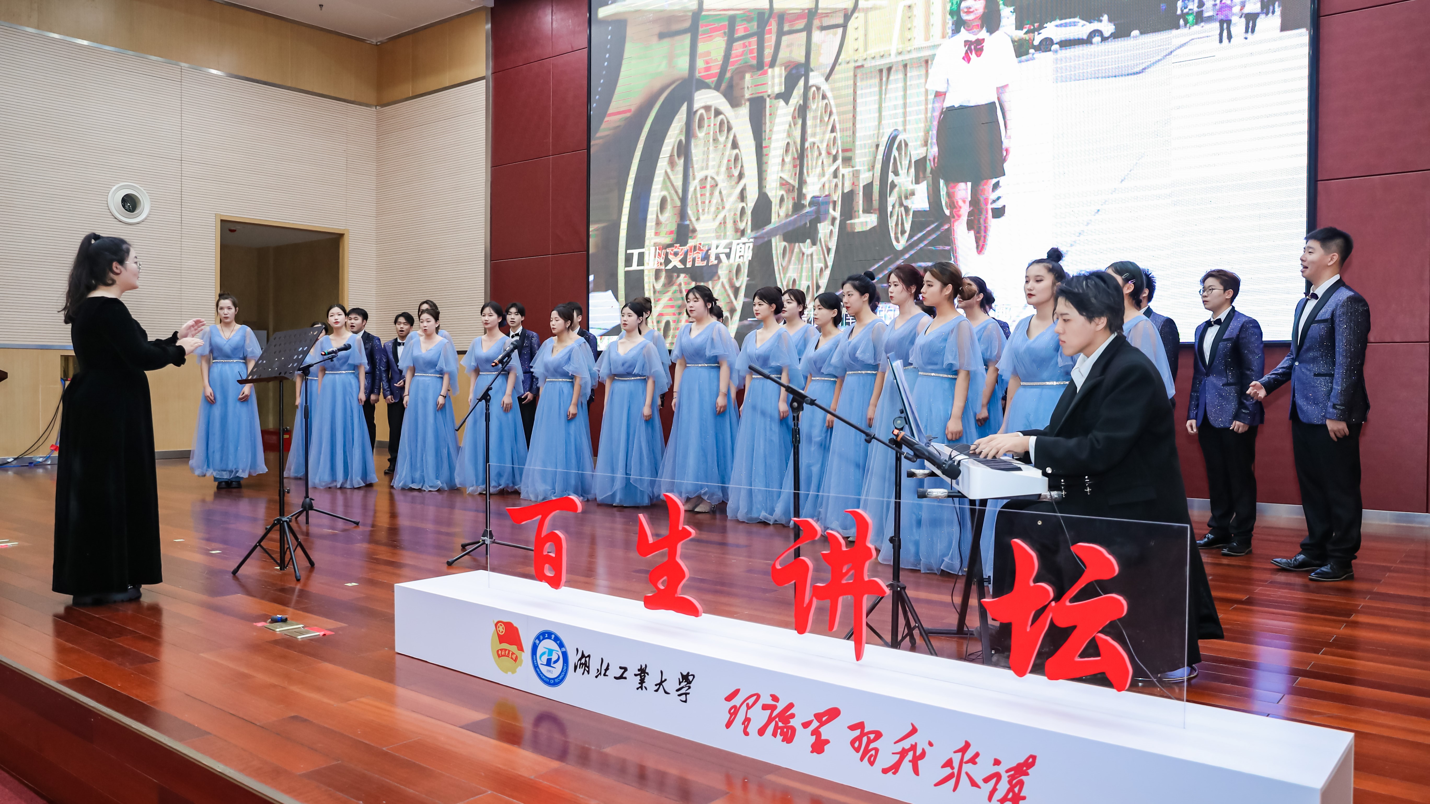 比赛现场,学校大学生艺术团合唱团为现场观众带来了湖工大版的《我喜欢》,用歌声展示了湖工大学子牢记习近平总书记殷殷嘱托,在巡司河畔壮筋骨、长才干的奋进历程。