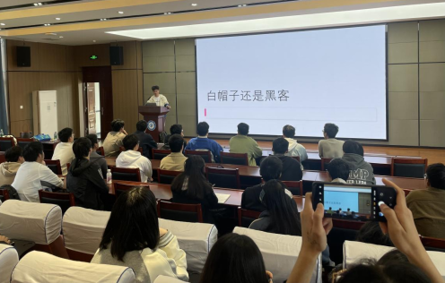 分享会上,他首先以“我的网安十年”为主题,以“白帽子和黑客”引入,通过分析国际网络安全事件案例,讲述当下网安技术在社会中的发展和应用,并强调遵守网络安全法规,知法守法,成为IT届的“白帽子”。期间,他与大家时时互动,提出事件中涉及的技术问题,并给积极答题的同学赠送了纪念品。