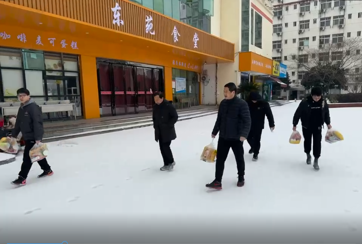 2月22日,新学期开学的第二天,武汉的“霰”雪将校园装扮得银装素裹,伴随着两天多的冰冻雨雪天气,交通出行十分困难,已返校学生的生活与取暖、出行与安全等问题成为全校师生的共同牵挂。为减少学生外出带来安全风险,工业设计学院学工办冒雪紧急采购了一批面包、牛奶、泡面、火腿肠等临时生活物资,为学生送去温暖与关怀。