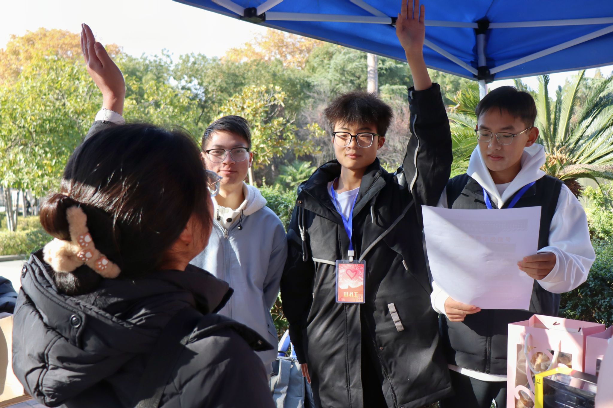“来跟着我把左臂向前上方直伸,掌心向前,再猜猜看这个手势是什么意思?”“我知道,这个手势是停车信号的意思。”大多数参与者跟着志愿者一起做交通指挥手势,模仿标准后,能够立马说出正确的手势含义。据了解,志愿者准备了8个常用常见的交通指挥手势,旨在帮助同学们在出行时能够迅速识别,避免事故发生。