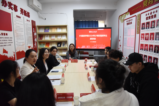 4月11日下午,外国语学院在“红星”一站式学生社区召开少数民族学生座谈会。外国语学院党委书记张志国、院长鲁修红、党委副书记胡文敏、学工办主任张薇、校学工部少数民族辅导员卡米拉老师与同学们深入座谈、交心谈心。