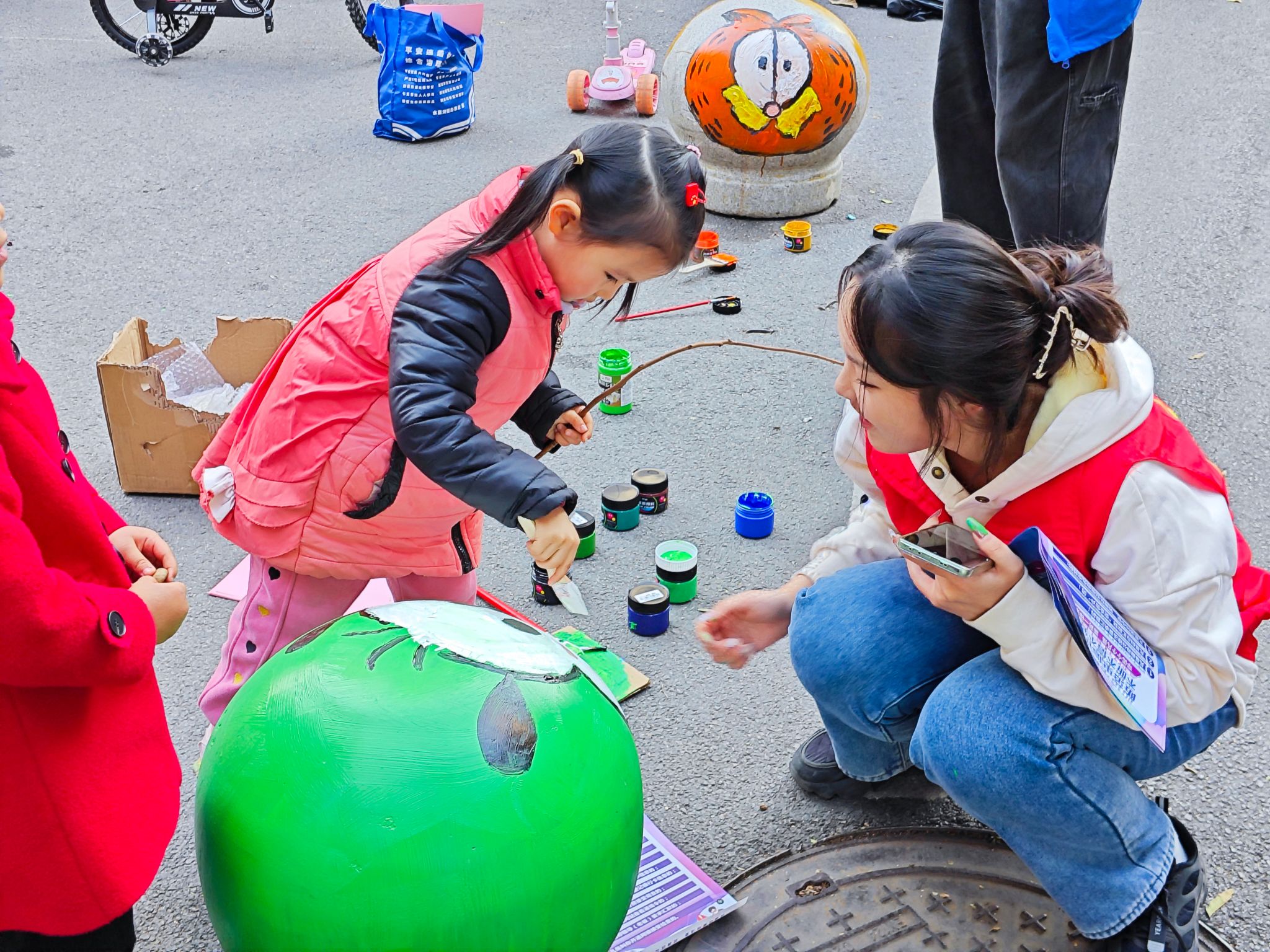 此次石墩绘画活动融合航天飞行、创意动画等元素,一个个石墩在志愿者的笔下添上色彩,披上外衣,冰冷的石墩瞬间被“激活”,充满了生命的力量。活动吸引不少社区居民驻足围观,在志愿者的指导下,一些居民也加入活动,拿起画笔为石墩上色。