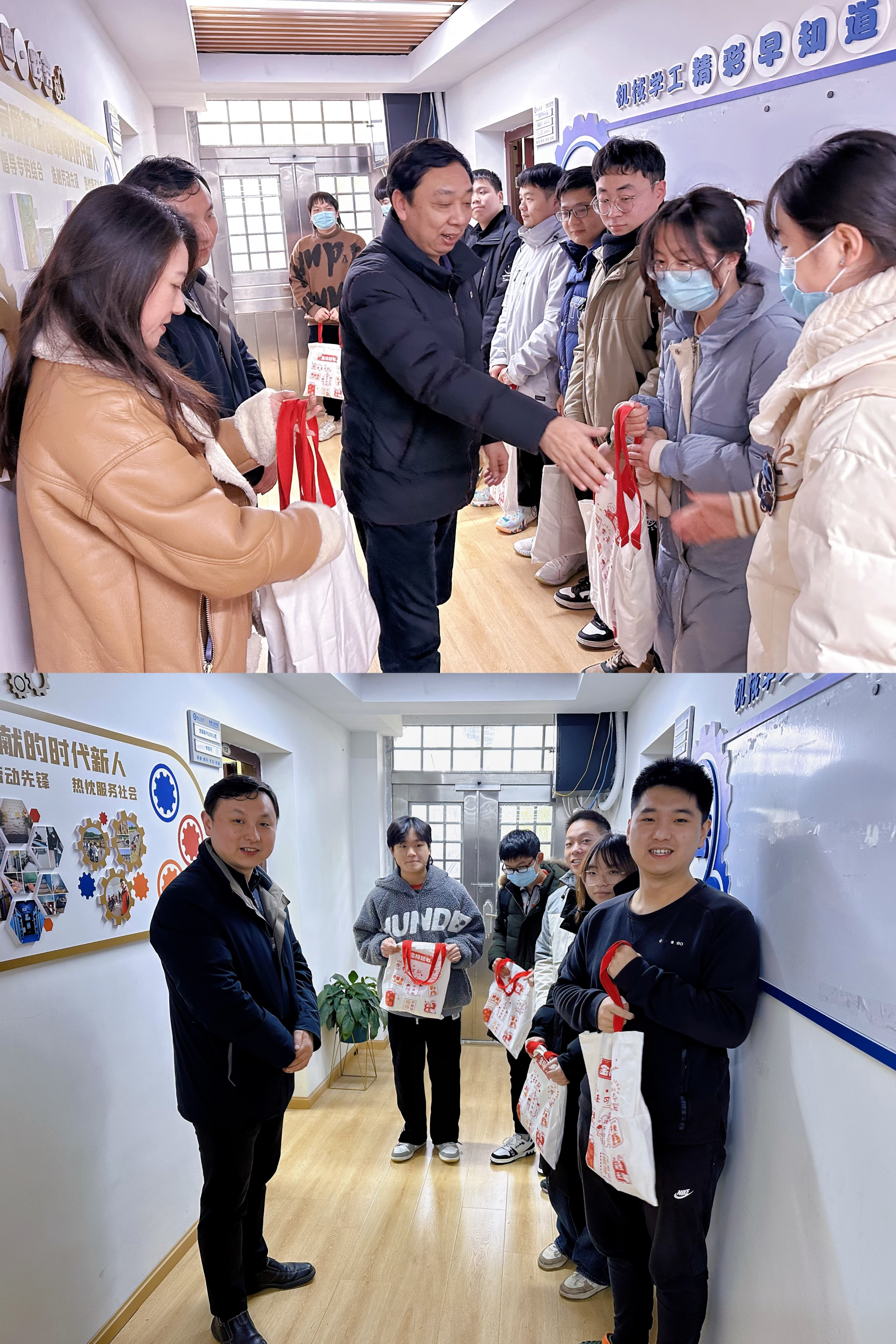 12月13日,正值考研倒计时十天,在这个有着特殊寓意的日子里,机械工程学院党政领导班子深入一站式学生社区驿站看望慰问2024届考研学子,学院党委书记王雷、党委副书记李亚丹、副院长聂磊为考生送上了寓意“十全十美、一研为定”的考研大礼包和鼓励祝福。
