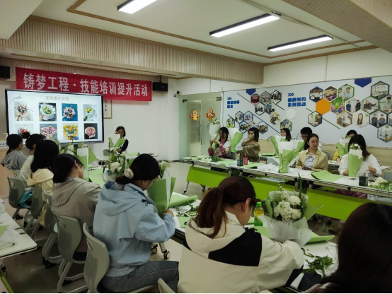 活动伊始,郭香老师详细介绍了插花艺术的基本知识,包括花材的选择与处理以及插花技巧。随后,同学们纷纷动手实践,运用所学知识进行创作。在郭香老师的耐心指导下,同学们逐步掌握了插花技巧,创作出了一幅幅独具特色的花艺作品。活动现场,大家积极交流想法,分享创作过程中的喜悦与困惑,活动氛围热烈。