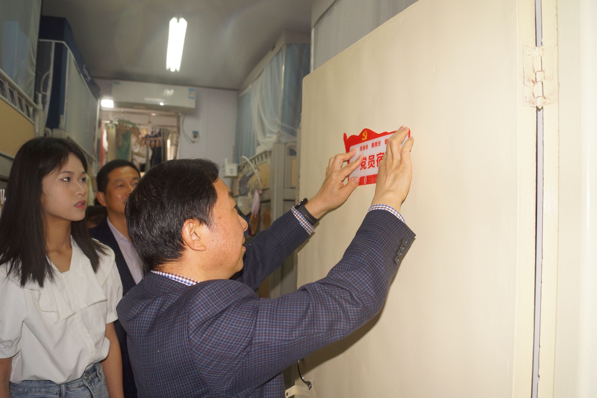 王地国作总结讲话。他指出,党员寝室挂牌既是展示荣誉,也是激励和鞭策。作为党员寝室的一员,一是要增强荣誉感,强化身份意识、纪律意识、规矩意识,做一个遵规守纪的好党员;二要发挥先锋模范作用,在政治思想、勤学励志、科技创新、文化体育、管理服务等方面追求卓越,发挥好示范引领作用;三是要模范践行群众路线,主动为身边同学服务,带头营造安全文明和谐宿舍,真正做到“建好一个寝室、带动一个班级、影响一个年级”。随后,王地国来到学生党员寝室走访检查,并同学生党员一起悬挂党员寝室标牌、张贴党员承诺书。