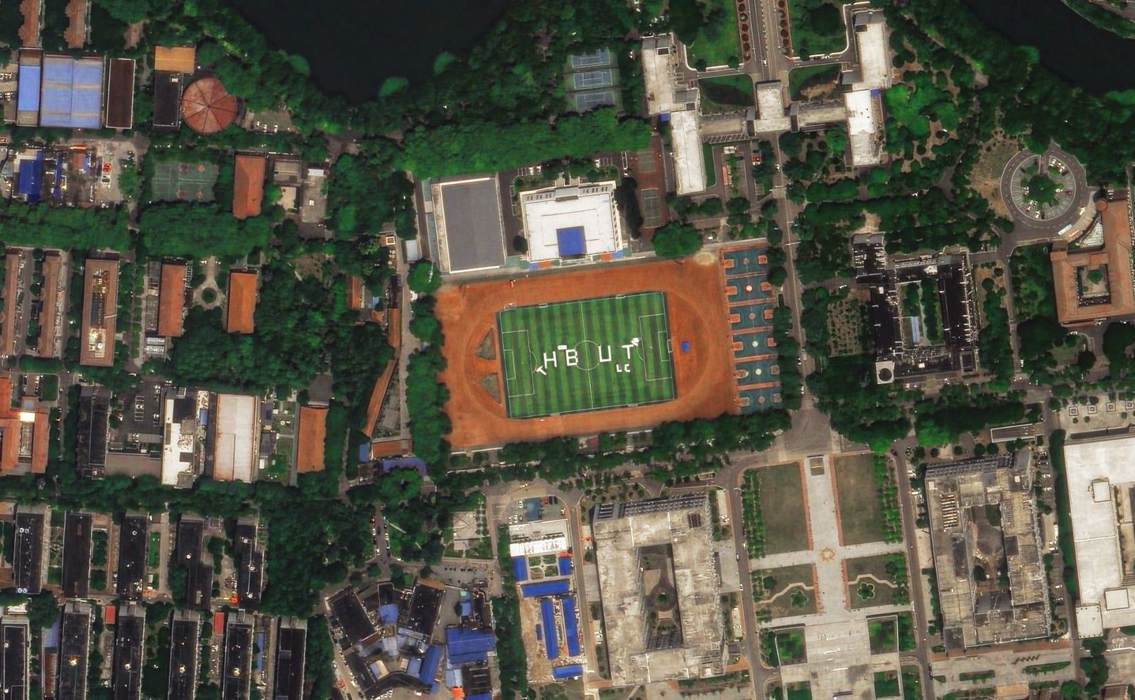 图案由金工锤、学士帽、“HBUT”、“LC”字母组成。照片中,卫星拍摄的图案清晰可见。