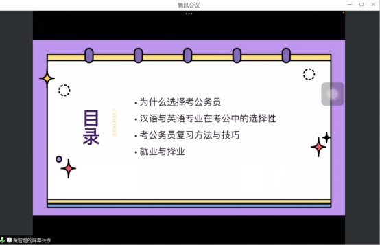 黄智煜校友与同学们分享了她从毕业时参加西部计划到如今成功考上公务员的这段经历。黄智煜谈到自己在毕业时也很迷茫,对未来很困惑,当看到西部计划招募公告时,本着对国家基层项目的向往和希望锻炼自己的初衷,积极报名参加并成功入选,在新疆建设兵团第一师阿拉尔市服务两年,期间因工作表现优异被评为优秀志愿者。黄智煜用自身经历和同学们分享了西部计划期间的所感所获,这一宝贵经历也帮助她更好地理解国家基层项目和公务员体系。在就业与择业方面,黄智煜劝导同学们走出精神内耗,摆正心态多尝试,通过实践明确自身认知和定位,更好地把握机遇。