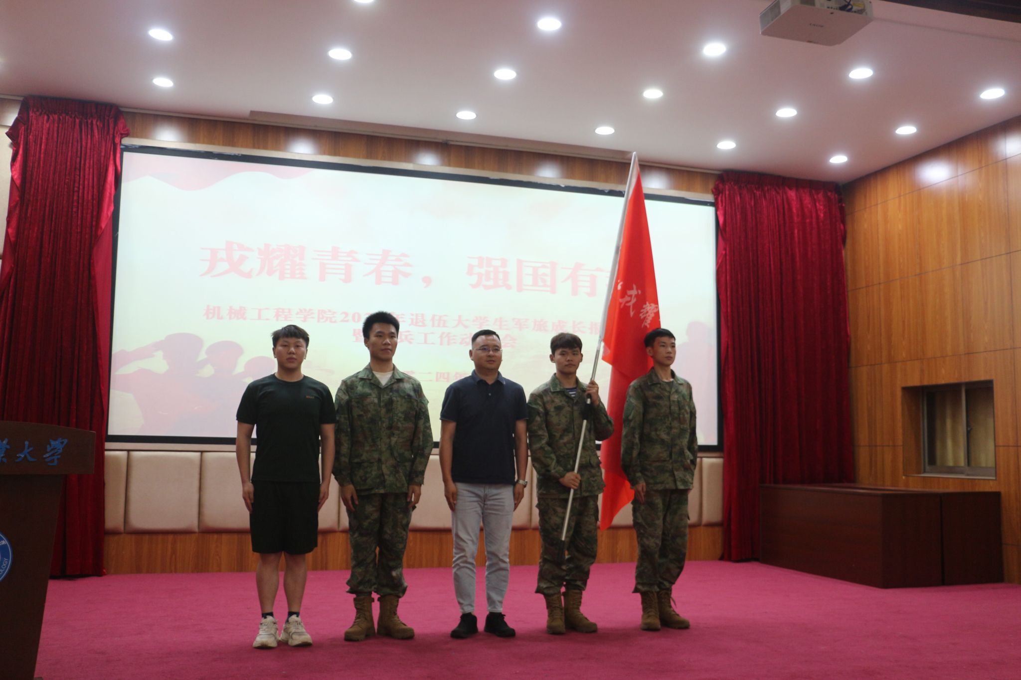 武装部副部长闫锋为机械学院“戎耀”退伍大学生先锋队授旗并作总结讲话。他用“哪有什么岁月静好,只不过有人替我们负重前行”、“到祖国最需要的地方建功立业,让自己全方位的成长进步”和“从湖工大去参军入伍,你只要报名,剩下的服务工作交给我们”三句话鼓励同学们勇于参军入伍,主动担负起时代赋予的责任,用行动绘就青春的底色,为强军梦强国梦注入青春力量。他指出,学校和学院作为大家的坚强后盾,入伍期间和退伍复学过程中一定会为大家做好全方位咨询和服务工作,为入伍大学生提供最优质的生活、学习保障。