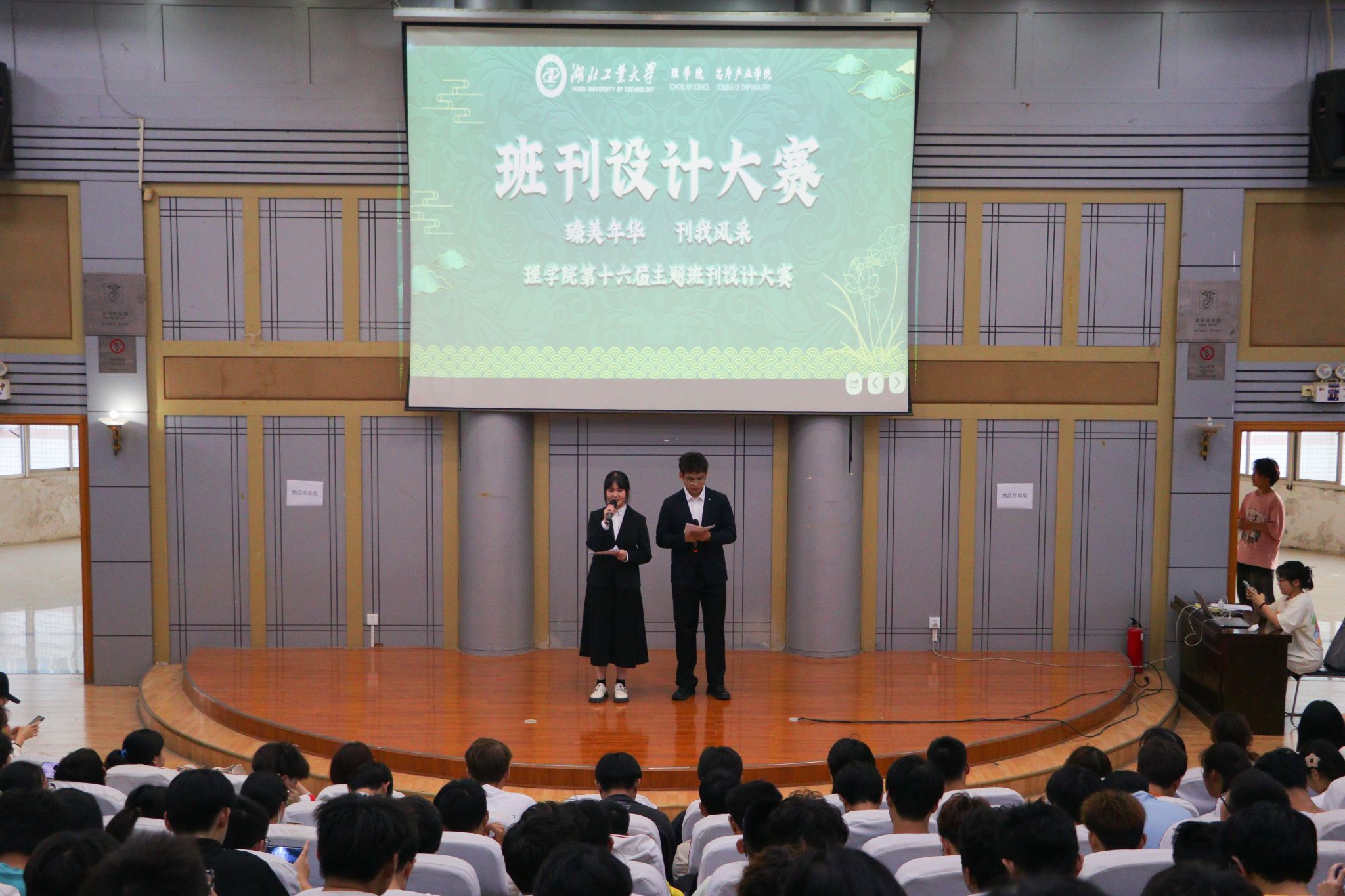 班刊设计大赛上,各班一一展示由班级集体原创的班歌、班徽、班级视频、班级海报等。