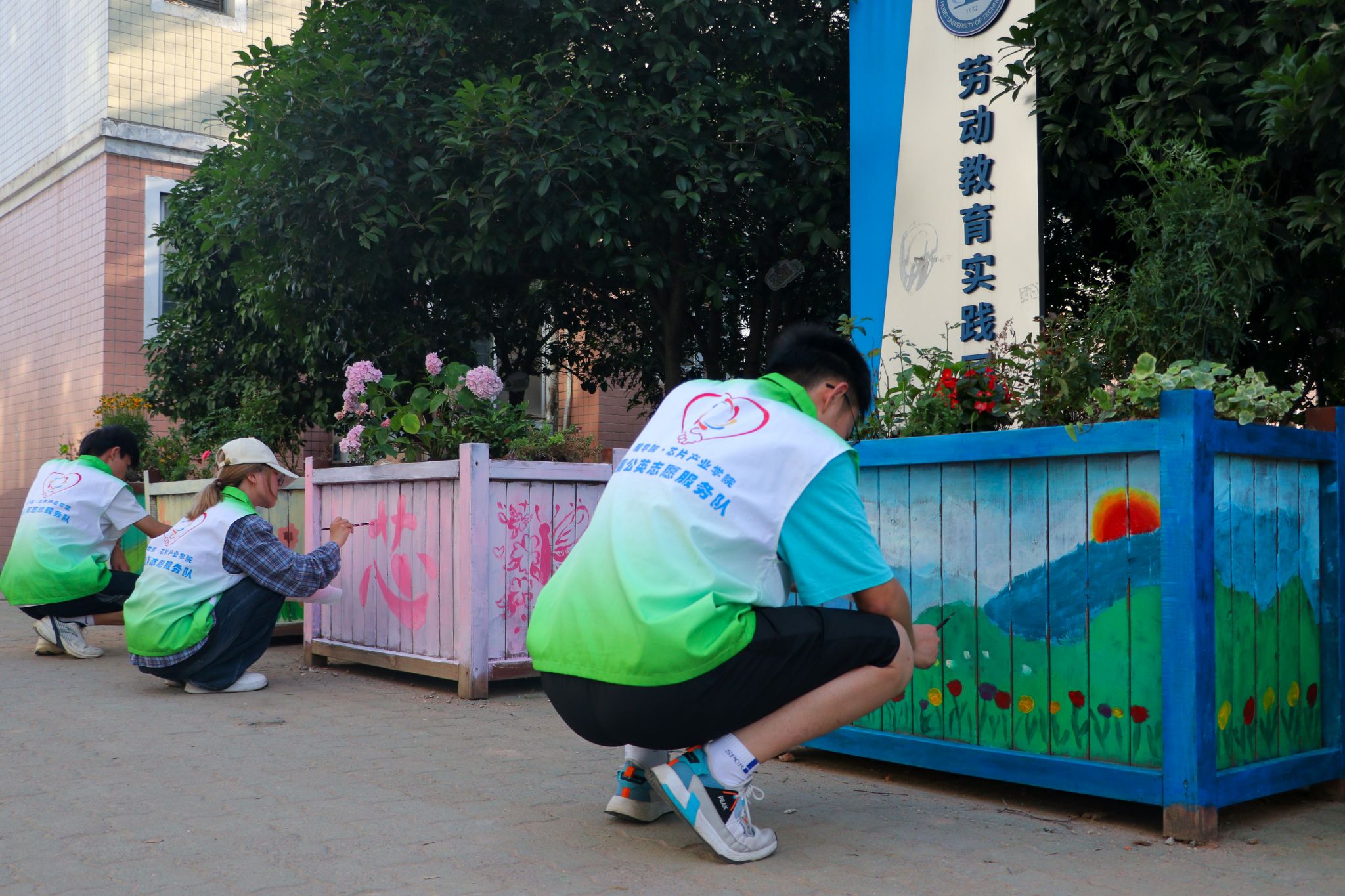 “花箱彩绘”活动中,参加活动的同学们聚集在学院劳动教育基地的花箱旁,发挥想象力,用画笔粉饰着花箱。