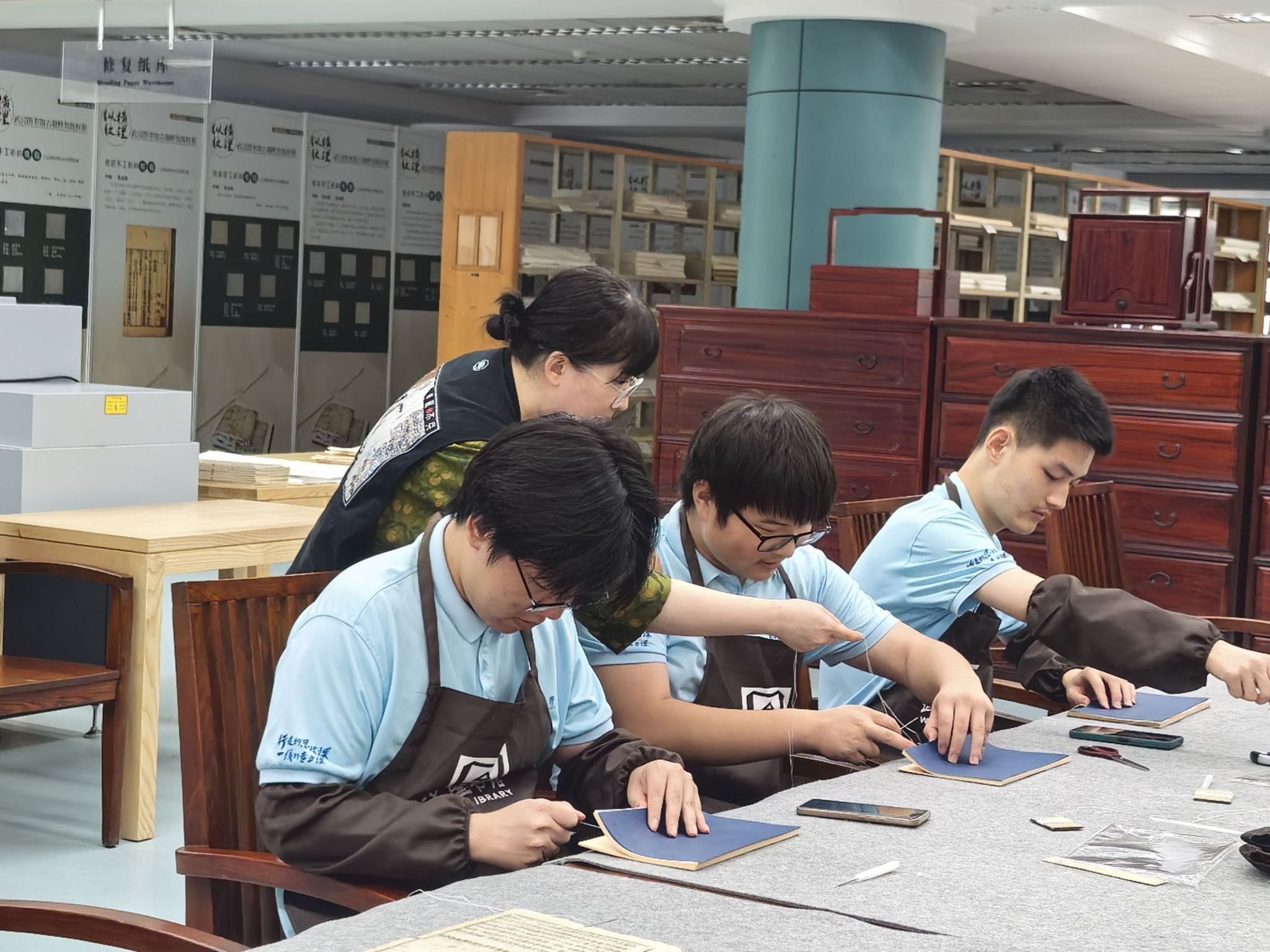 制定修复计划、拆书、蘸取浆糊涂抹古籍破损处,取补纸覆盖拍打,使其与古籍完美贴合……15日上午,在武汉图书馆古籍修复中心老师们的指导下,队员们亲身体验修复古籍、传拓、装帧等工艺。