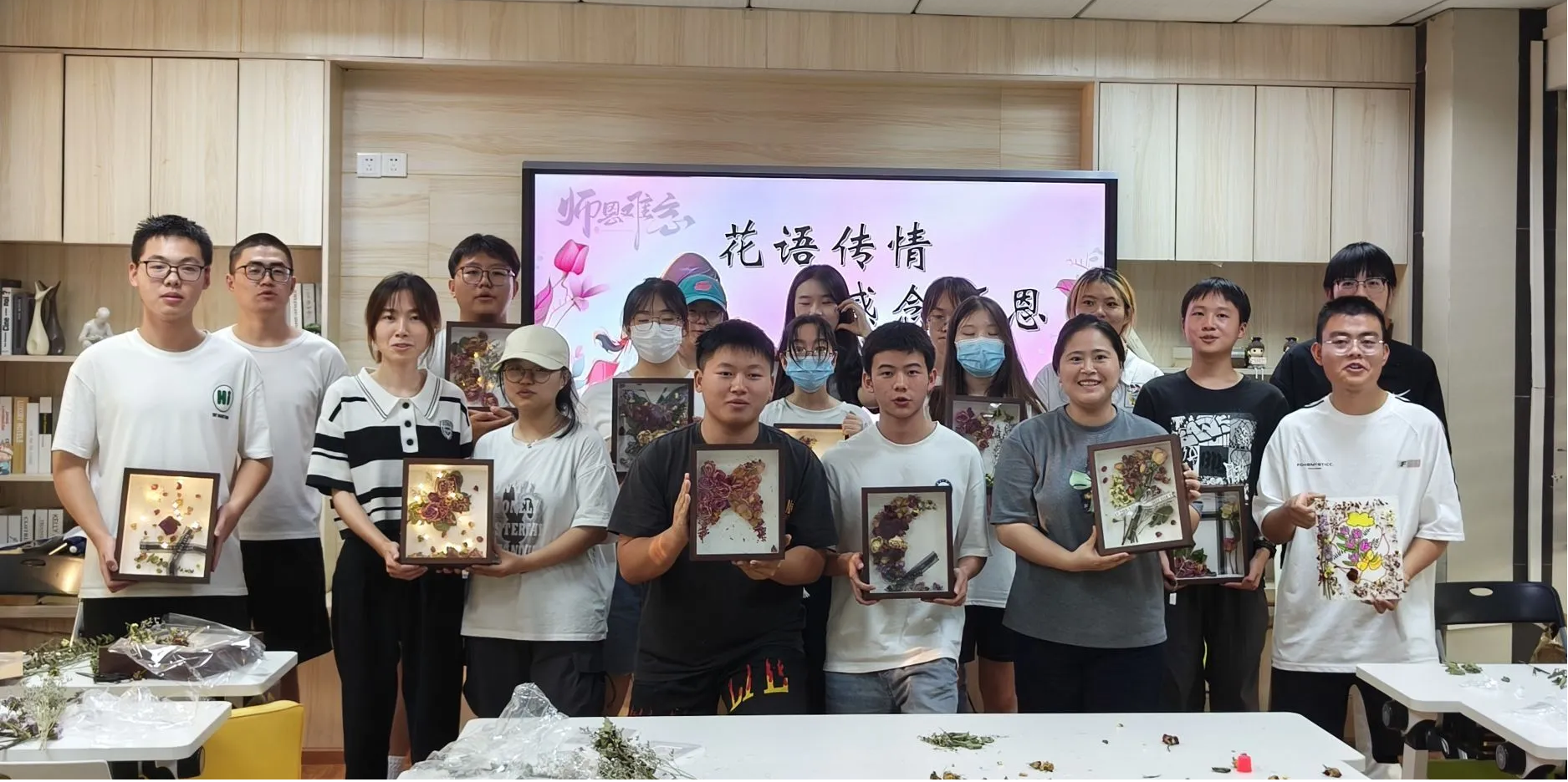 同时,学院在“一站式”学生社区知学空间举办了别出心裁的“干花相册”制作活动。学生们将一朵朵干花剪枝,或摆放成蝴蝶、月亮的造型,或配以自己亲手绘制的图案放入相框之中,每一件作品都饱含着对老师的深深祝福。