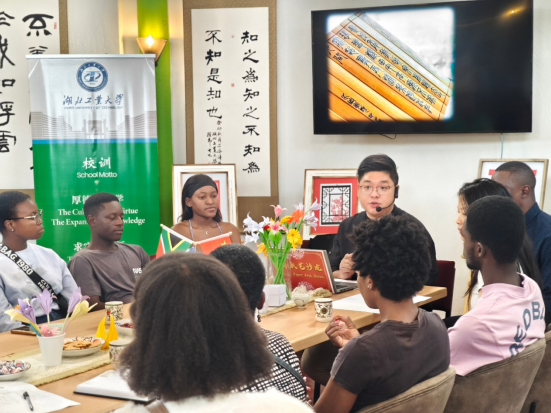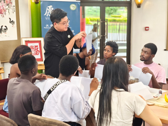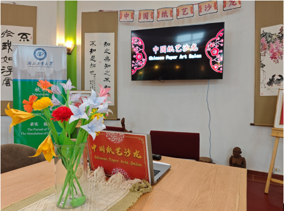 在与文达大学师生讨论了纸的历史与其对人类文明的重要价值之后,熊惟杰老师又带领参与活动的师生一起欣赏了湖北工业大学学生向绿色科技孔子学院捐赠的剪纸艺术品以及他和梁燊云、王雅君两位志愿者老师一起制作的折纸工艺品。