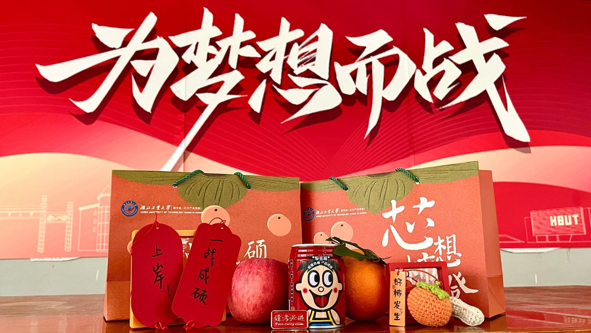 学院为每一名考研学生精心准备了“考研福袋”:外包装上有24级学妹亲笔书写的“芯想柿橙”、“一战成硕”祝福语;承载满满期许的“逢考必过”徽章,以及寓意诸事顺遂的“好柿花生”挂件,方寸之间寄托着学院最美好的祝愿;新鲜水果装满了祝福的“小心机”,红彤彤的苹果寄语“苹稳上岸”,黄澄澄的橙子象征“心想事橙”;镌刻着同学名字与专属祝福语的旺仔牛奶,助力他们元气满满迎接挑战。