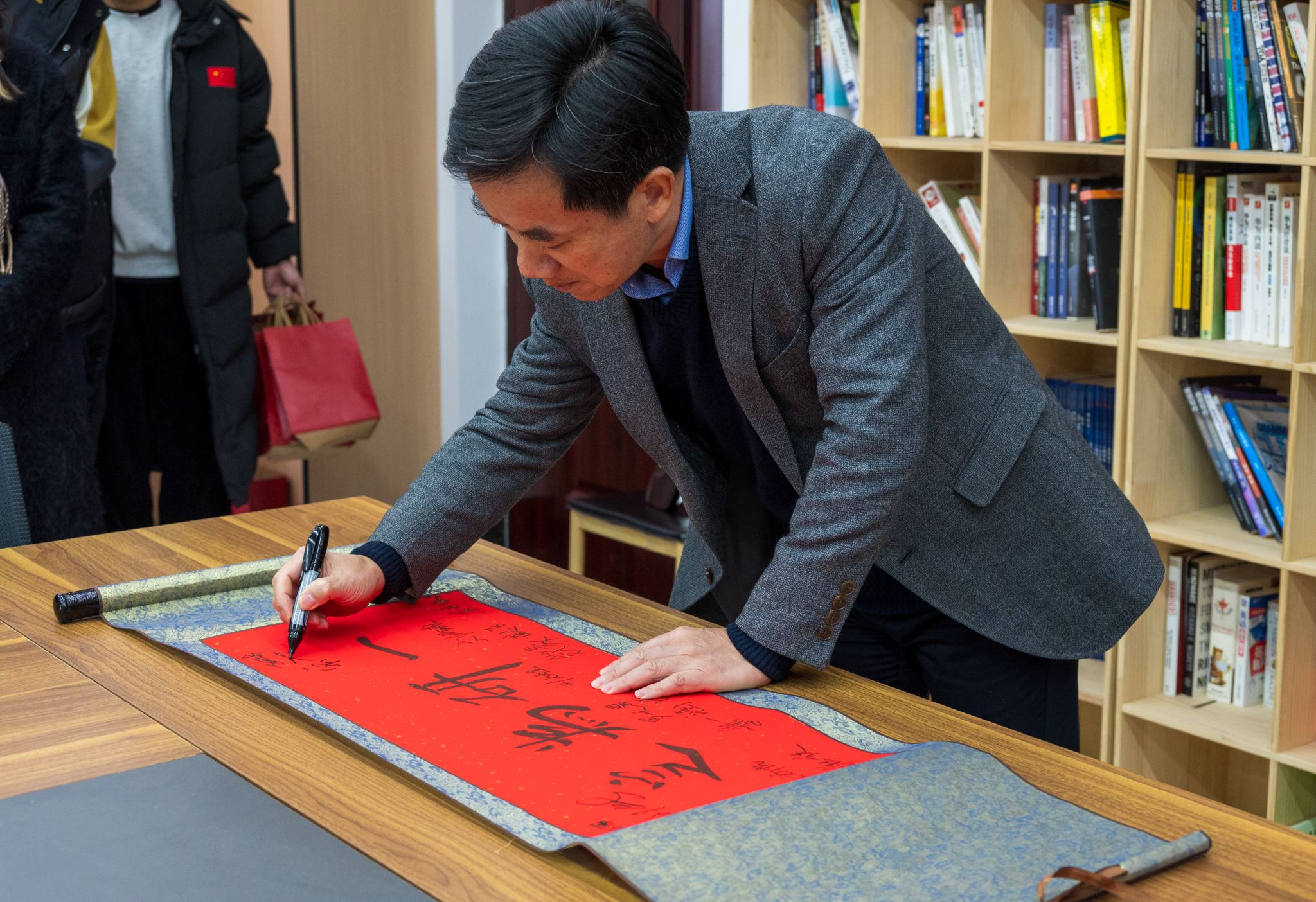 在活动中,宋校长和考研学子代表共同在“一研为定”的书法卷轴上签名祝福,为大家送上了精心准备的考研大礼包,并与大家合影留念。