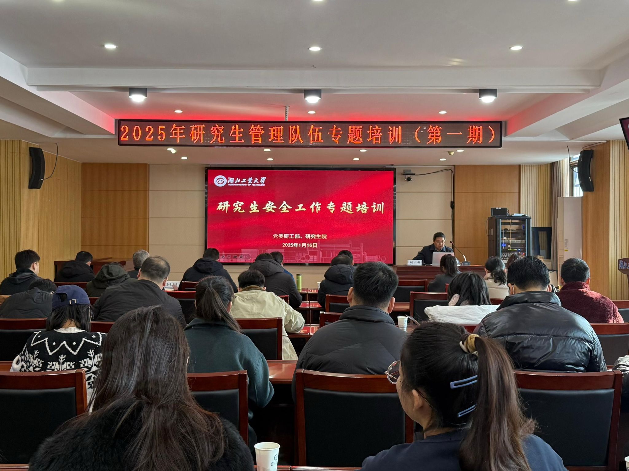 1月16日上午,研究生管理队伍2025年专题培训第一期在行政楼一楼会议室顺利举行。本次专题培训以“研究生安全工作专题培训”为主题,由党委研工部副部长黄华主讲。研工部相关领导、各学院分管研究生工作院领导、全体研究生辅导员参加培训。