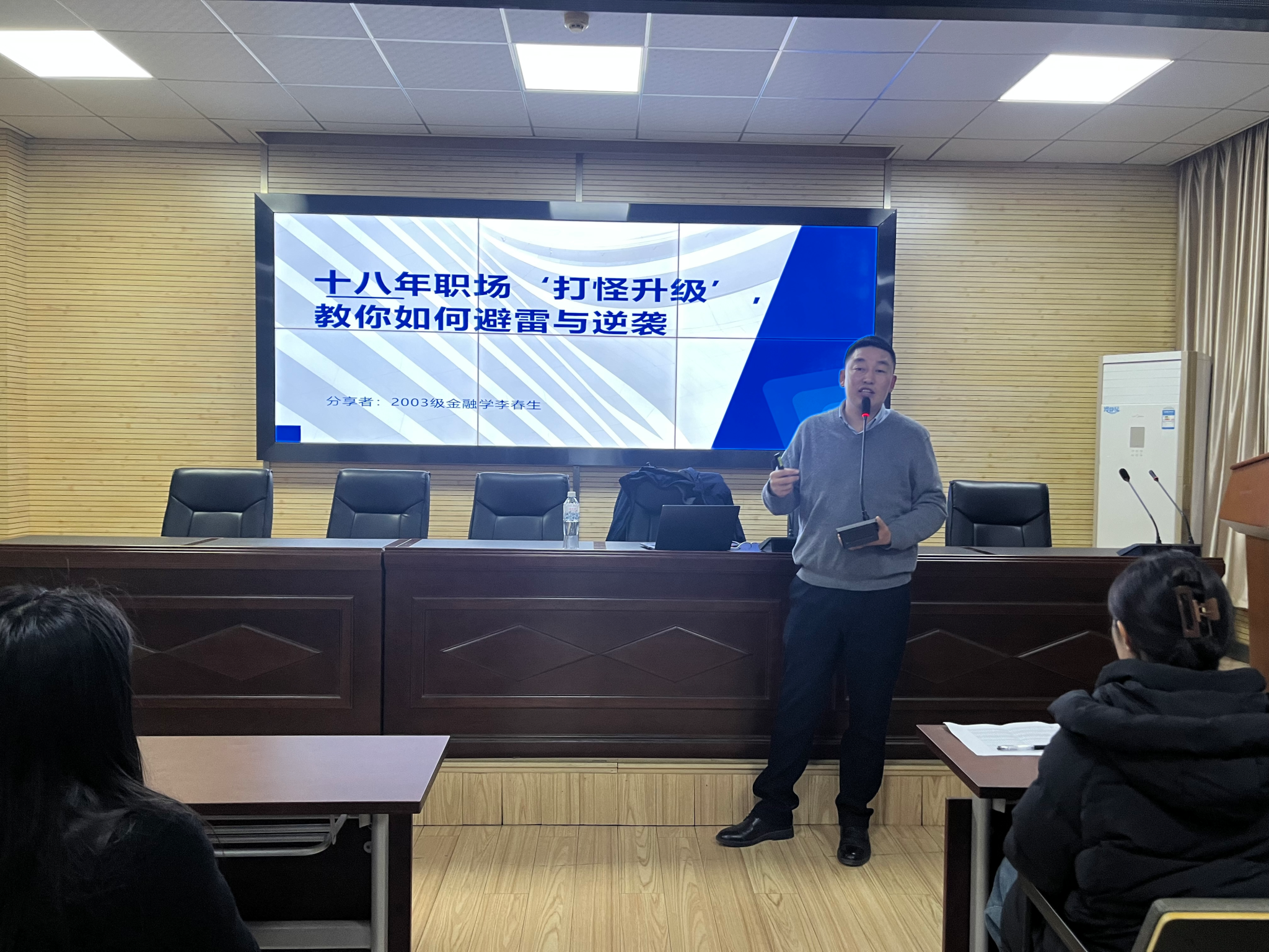 李春生结合自身经历,从职场适应力、核心竞争力、避雷技巧和突围策略等方面展开分享,语言幽默,案例生动,干货满满。互动环节,同学们踊跃提问,李春生耐心解答,以个人自身职场经历和经验为同学们答疑解惑,受到同学们的广泛好评。