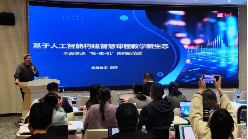湖北超星智慧课程事业部总监魏涛主讲《基于人工智能构建智慧课程教学新生态——全面落地“师—生—机”协同新范式》专题讲座,从课程图谱构建、AI工具各场景全过程赋能教学、课程专属智能体训练到数智赋能专业建设案例分享,深入浅出地向老师们讲解了如何利用智慧课程构建全新的教学生态,为传统教学注入新的活力。讲座现场,教师们与魏涛总监就教学中的实际问题和智慧课程的应用前景等话题深入互动,围绕AI课程设计、AI助教运用等方面进行实操训练。
