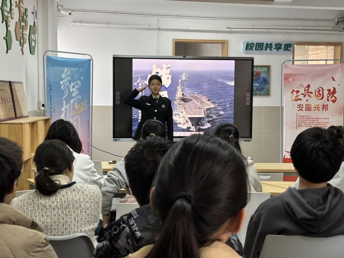 活动伊始,梁爽、巩雨洁结合自身军旅生涯,围绕大学生征兵政策展开详细讲解,并以“青春与迷彩相遇”为主题,通过视频和照片生动还原军营生活。她们向在场同学展示了青春的另一种打开方式,一身戎装就是一份荣耀,更是保家卫国的承诺。