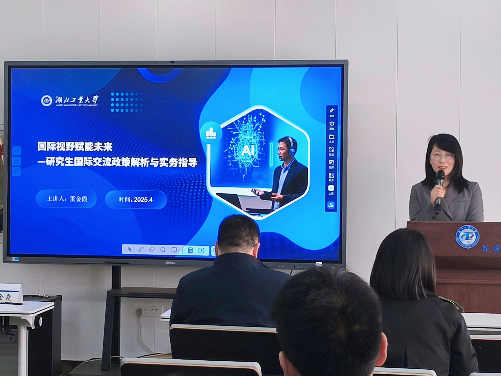 董金霞以“国际视野赋能未来——研究生国际交流政策解析与实务指导”为题,围绕我校研究生出国出境交流访学的相关工作,从为何国际化能力是研究生的“刚需”、如何用好国家公派留学资源、如何用好湖工大国际化资源和行动呼吁等四个方面入手,深入浅出地进行了细致讲解。她为大家分享了五类公派研究生项目,并就如何用好湖北工业大学国际化资源介绍了两大行动计划。
