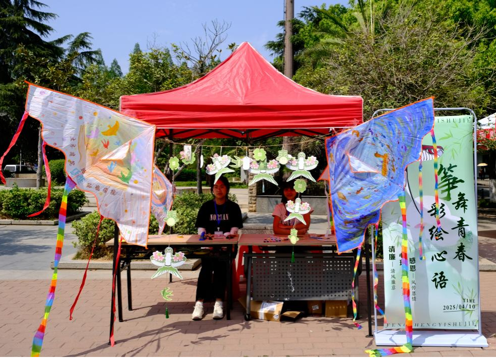 “心鸢寄梦”区,由院团委学生会集体创作的2只巨型主题风筝率先亮相,与展架上特制小风筝相映成趣,这些小风筝背面写有学子们的匿名心事与期许,形成独具特色的“空中解忧信箱”。