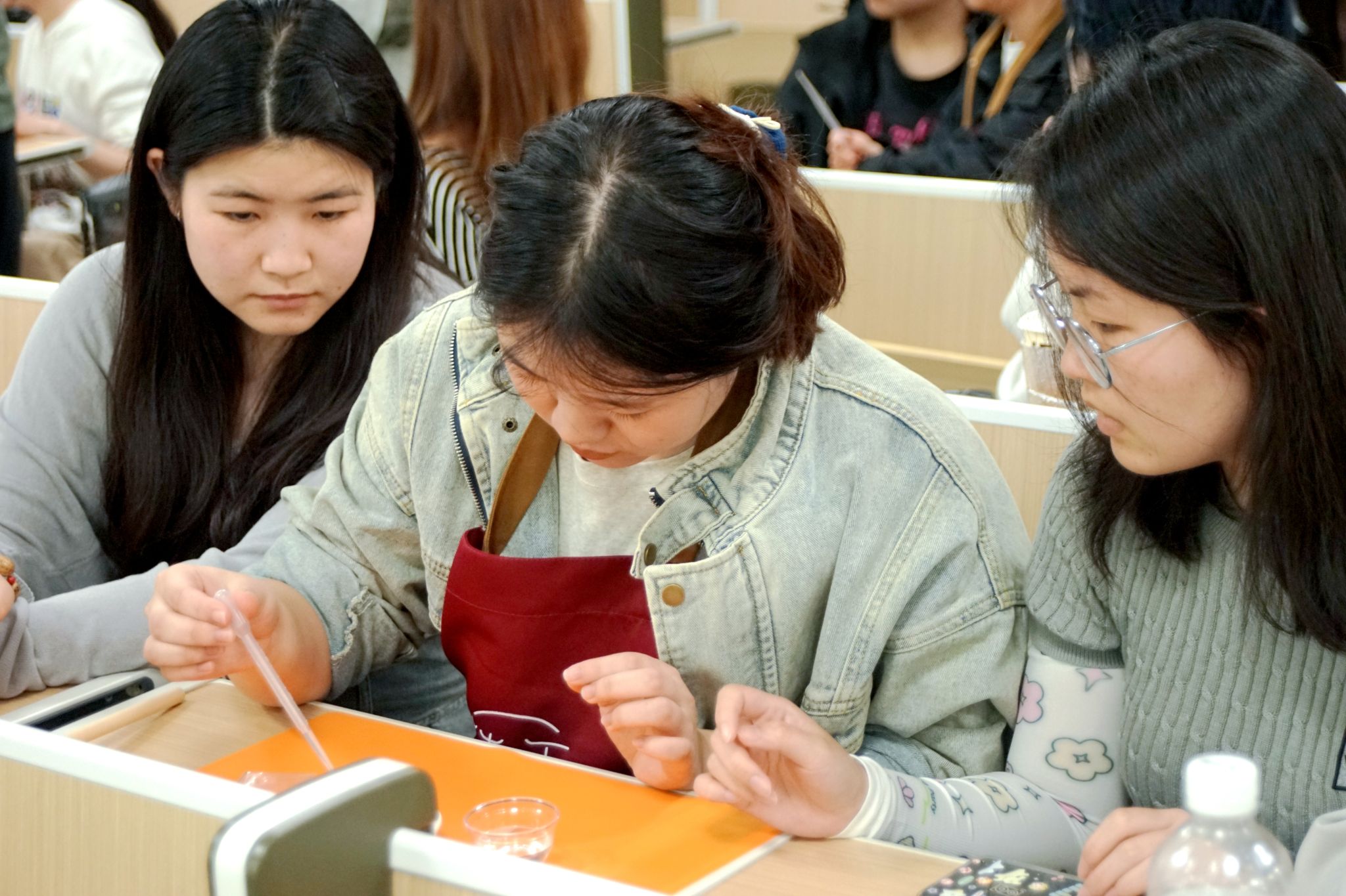 为了让师生能更加近距离体验非遗文化魅力,启动仪式结束后,学院为四位非遗传承人分别安排教室,开展现场教学活动。韩雪老师从药香发展史讲到现代康养应用,张其华展示融入时尚元素的非遗粗布,沈邦汉现场拆解微缩古建中的榫卯玄机,赵凤林则用锔瓷技艺演绎“瓷韵重生”的东方智慧。400余名学子零距离接触非遗工艺,从调香配比到织机穿梭,从木构件拼接到瓷器锔补,在传承人手把手指导下完成首件非遗作品。