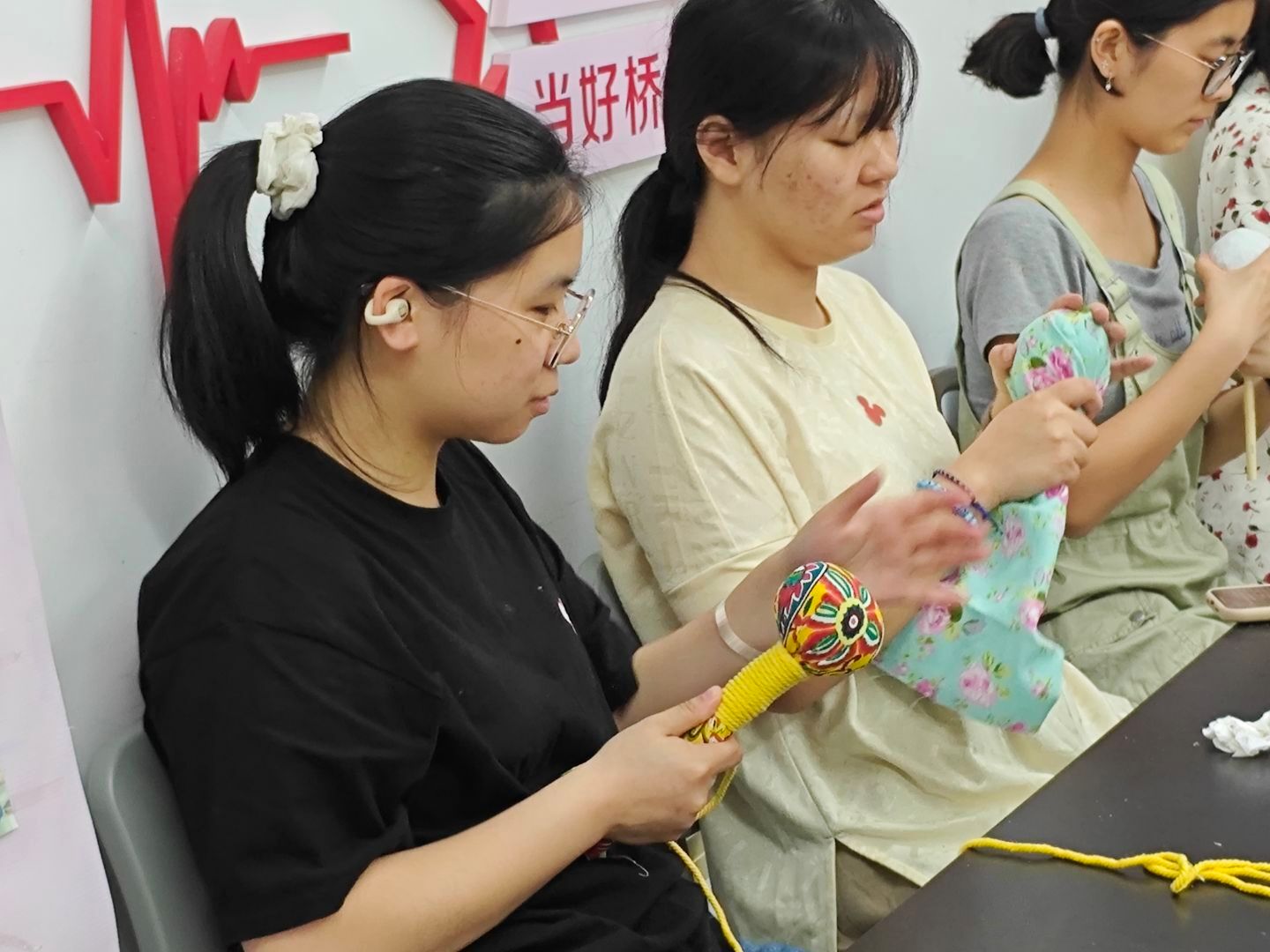 结合谷雨时节“祛湿防病”的养生习俗,活动还设置了艾草锤手工制作环节。活动室内弥漫着艾草特有的清香,同学们认真揉搓、捆扎,制作属于自己的养生锤。“轻轻敲打肩颈,艾草的清香能舒缓情绪。”主持人介绍,“艾草锤既是非遗文化的载体,也是缓解疲劳的实用工具,呼应了节气养生‘身心共调’的理念。”制作完成后,主持人带领大家进入“艾草锤拍八虚”体验环节。“肘窝、腋窝、腹股沟和腘窝,这八个部位在中医里称为‘八虚’。”主持人一边示范一边讲解,“谷雨时节湿气重,用艾草锤轻拍这些部位可以帮助祛湿养生。”同学们兴致勃勃地跟随主持人的指导,互相交流拍打手法和力度,现场充满了欢声笑语。