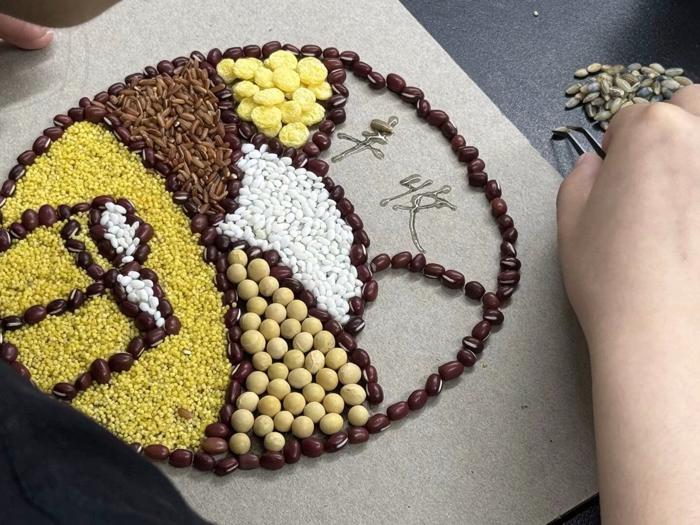 “谷雨,雨生百谷。”活动伊始,主持人以谷雨节气的物候特征与文化内涵为引,讲解五谷粮食画的起源与寓意。在粮食画制作环节,同学们充分发挥创意,将五谷化作艺术语言,创作出丰富多彩的作品。有的同学以金黄的稻谷拼贴出"五谷丰登"的丰收画卷,展现对美好生活的向往;有的同学用各色豆子勾勒出憨态可掬的小动物形象,充满童趣;更有同学大胆创新,用黑豆、红豆等拼出"奥特曼"等动漫形象,将传统工艺与现代元素巧妙融合。这些作品既体现了"雨生百谷"的节气特色,又展现了当代青年学子的创新思维。