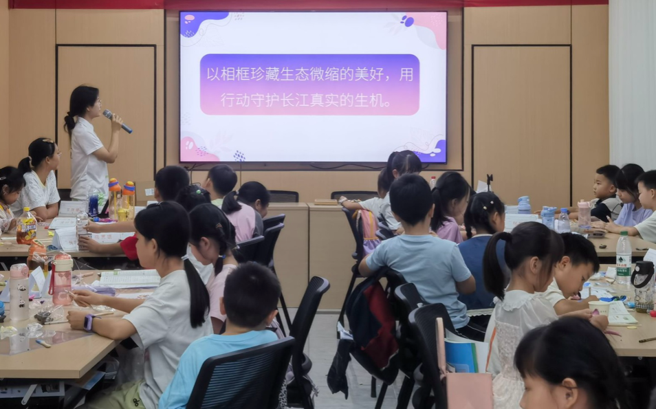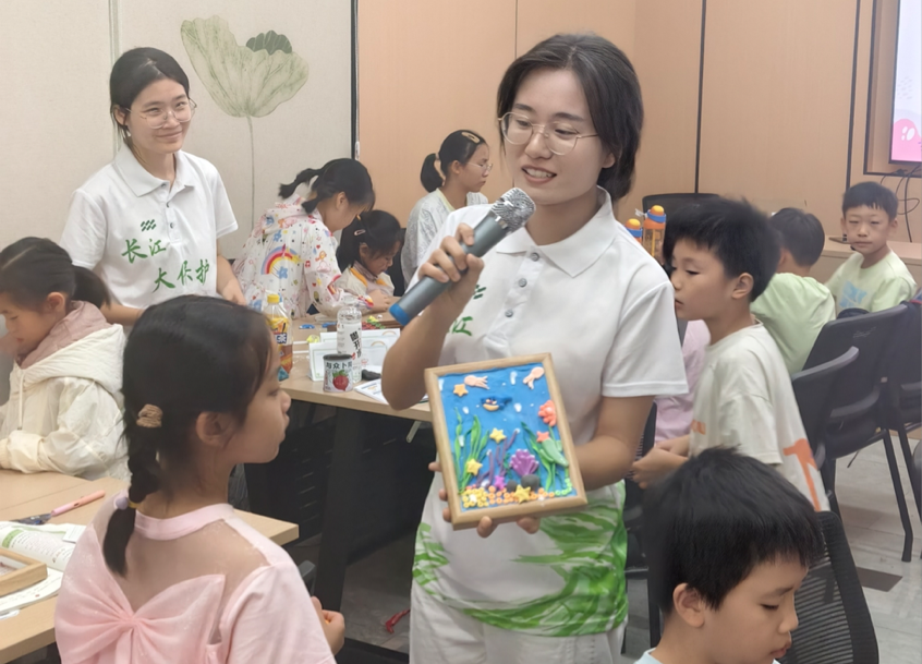 在随后的手工创作环节上,志愿者们教孩子们用彩泥创作长江生态图景,各组作品在相框中聚合,江豚、荷花与江水相映成趣,展现出孩子们对 “长江之美” 的独特理解。