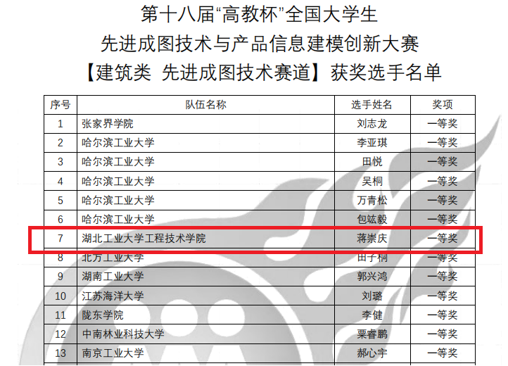全国大学生先进成图技术与产品信息建模创新大赛因规模大、水平高、参赛人数众多,被誉为“图学界的奥林匹克”,是图学类最高级别的国家级赛事。工程学子们能在此次赛事中脱颖而出,充分展现了学院的专业实力与教学水平。其中,23gb工管1班的蒋崇庆同学表现尤为突出,他在比赛中沉稳应对,凭借精湛的成图技术和卓越的产品信息建模能力,一举夺得建筑赛道全国第7名、湖北省第1名的优异成绩,这一成绩不仅是对他个人辛勤付出的肯定,也刷新了学院自参赛以来的最佳纪录,为学院赢得了荣誉。