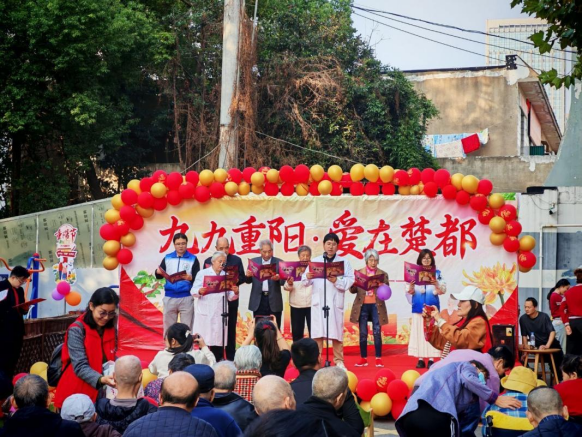 舞台上,热闹的表演轮番上演:活力的舞蹈点燃气氛,经典的歌曲勾起回忆,刚劲的武术赢得掌声,志愿者们全程陪伴在老人身旁,不时分享观演感受,现场暖意融融。最动人的环节当属集体朗诵,志愿者与老人们一同登上舞台,齐声诵读《情暖重阳,爱在楚郡》。抑扬顿挫的语调里,既有老人们对晚年生活的热爱,也有青年学子的诚挚祝福,敬老爱老的情怀在诵读声中静静流淌。“这是我第一次和老人们一起朗诵,他们眼里的认真和笑意特别打动人。”志愿者黄祉豪结束表演后仍难掩触动。