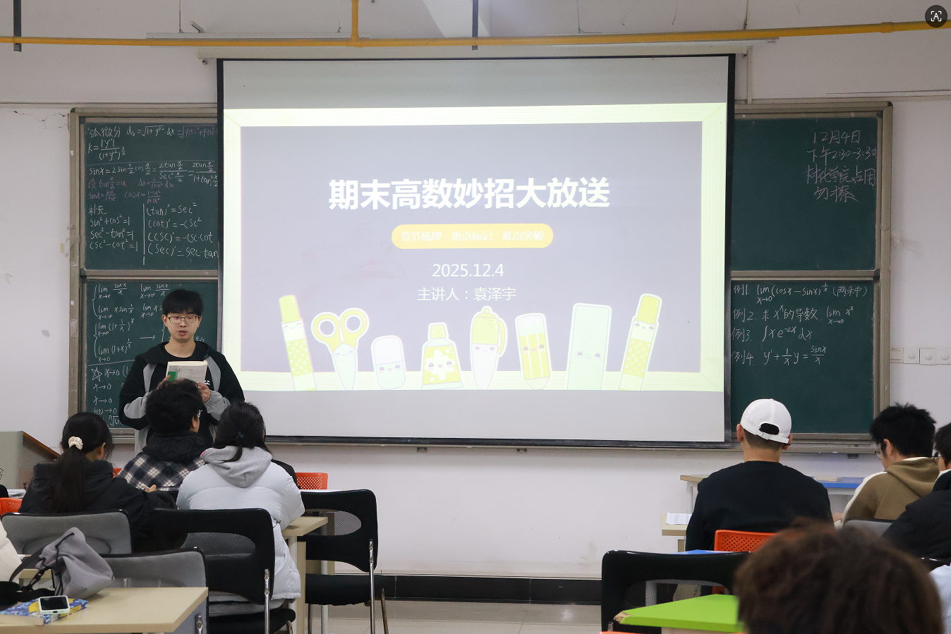 期末将至,高等数学复习让很多同学倍感吃力,2023级学业朋辈导师袁泽宇关注到这一问题,12月4日,他用别开生面的方式在5B-001为同学们解析重要知识点和难点,建议基础薄弱的同学先回归课本、进行全真模拟,有效训练答题节奏感、注重细节。为了帮大家稳住心态,作为过来人的袁泽宇同学用一句话点亮备考学子的信心:“成功就像一道定积分,努力是被积函数,坚持是积分区间,每一步付出,都在悄悄积累你的高分。”