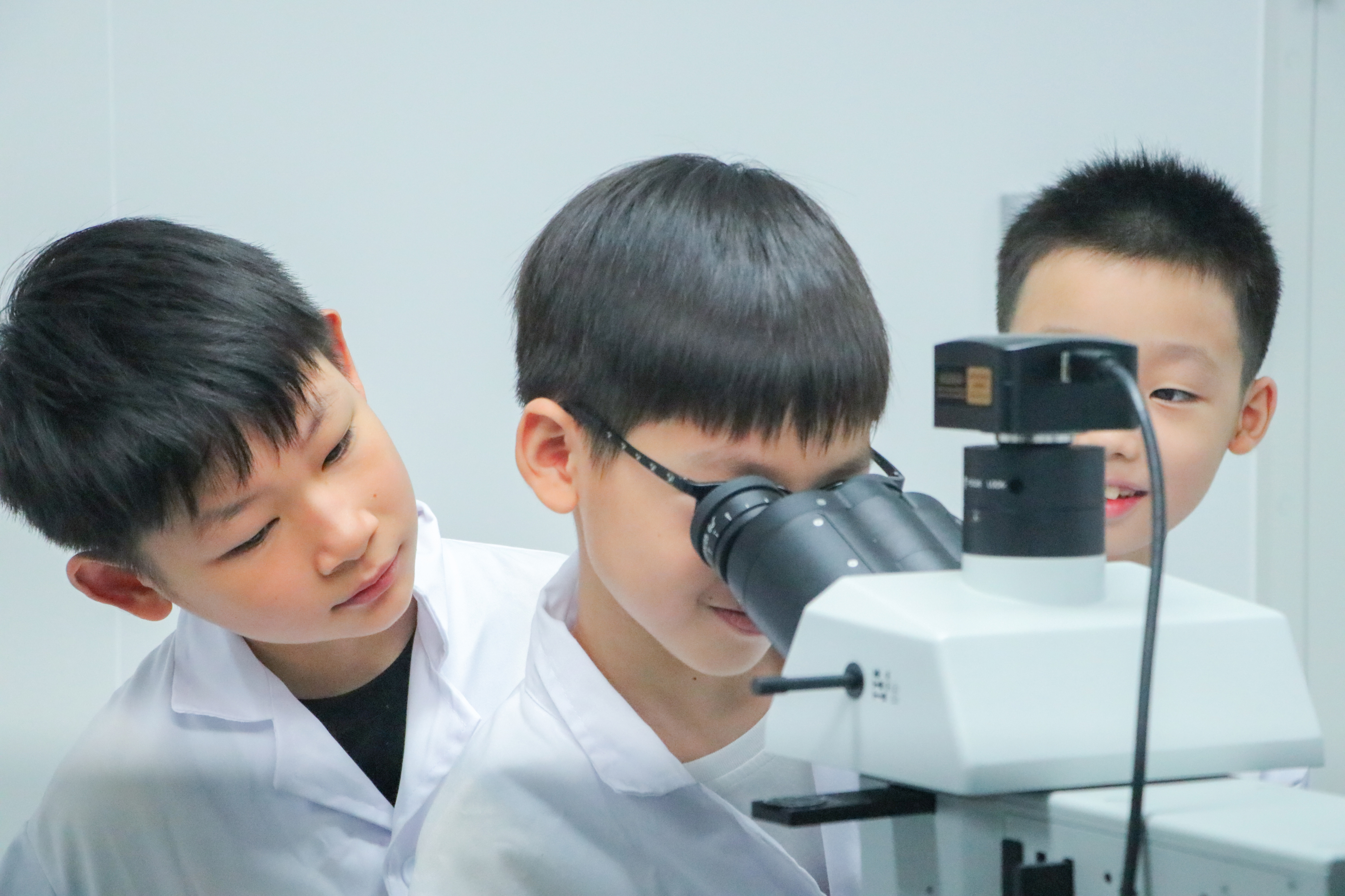 7月23日,武汉市江汉区民权街道打铜社区的小学生在湖北工业大学芯片实验室用电镜查看芯片微观结构。