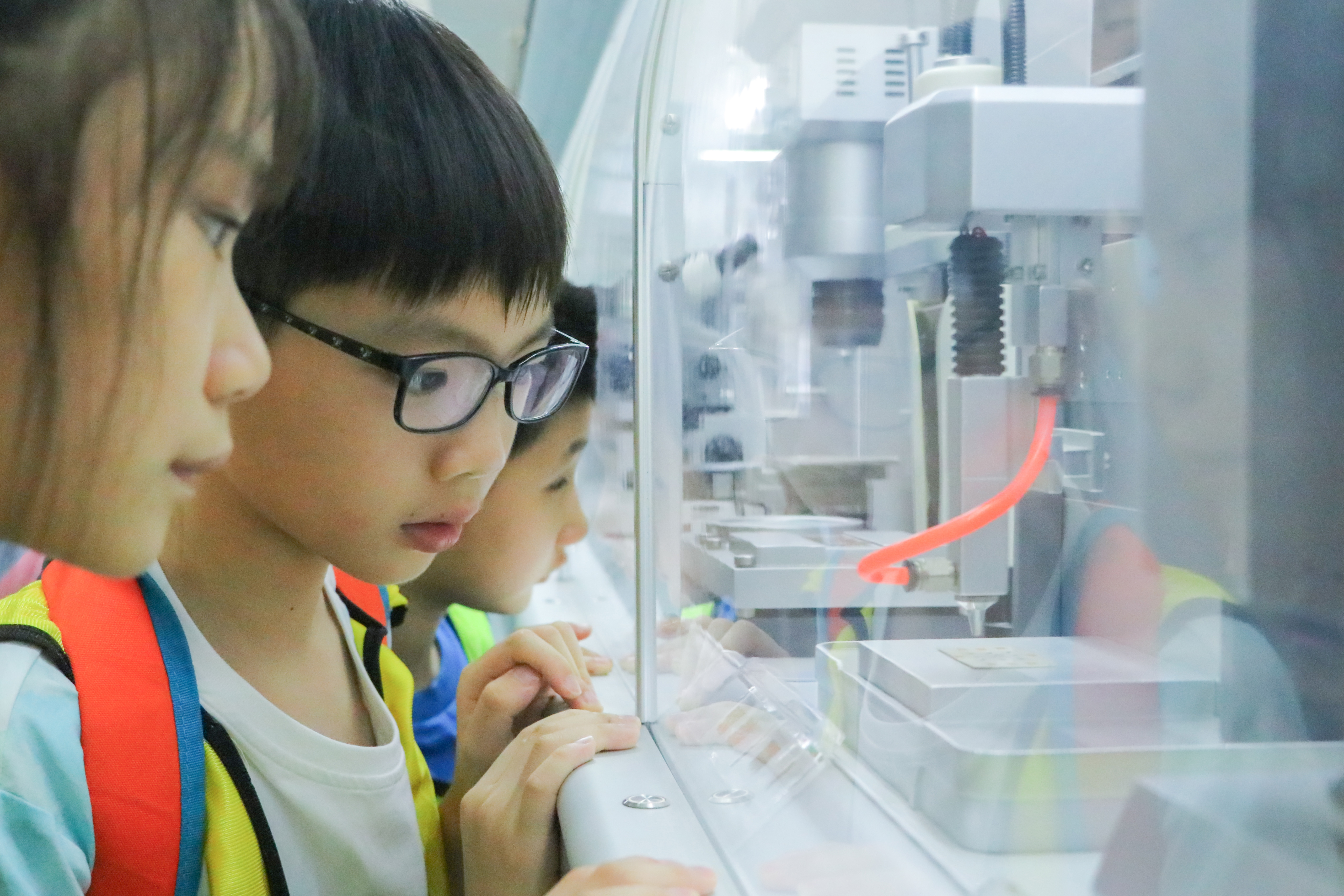 同学们在芯片制造流程科普演示台前聚精会神地观看。