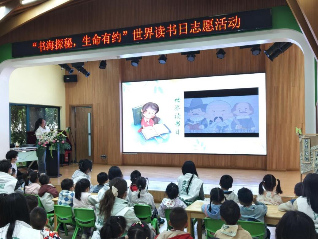 志愿者用生动有趣的动画视频引入本次活动主题,以“小侦探闯关”提问形式,带领小朋友们了解世界读书日的由来,引导孩子们开启阅读探索之旅。随后,主持人通过大屏幕带领孩子们共读经典绘本《小种子》,搭配趣味互动,引导孩子们跟随小种子旅行、扎根、发芽、开花的情节抢答、模仿动作,在欢声笑语中读懂生命成长的秘密。
