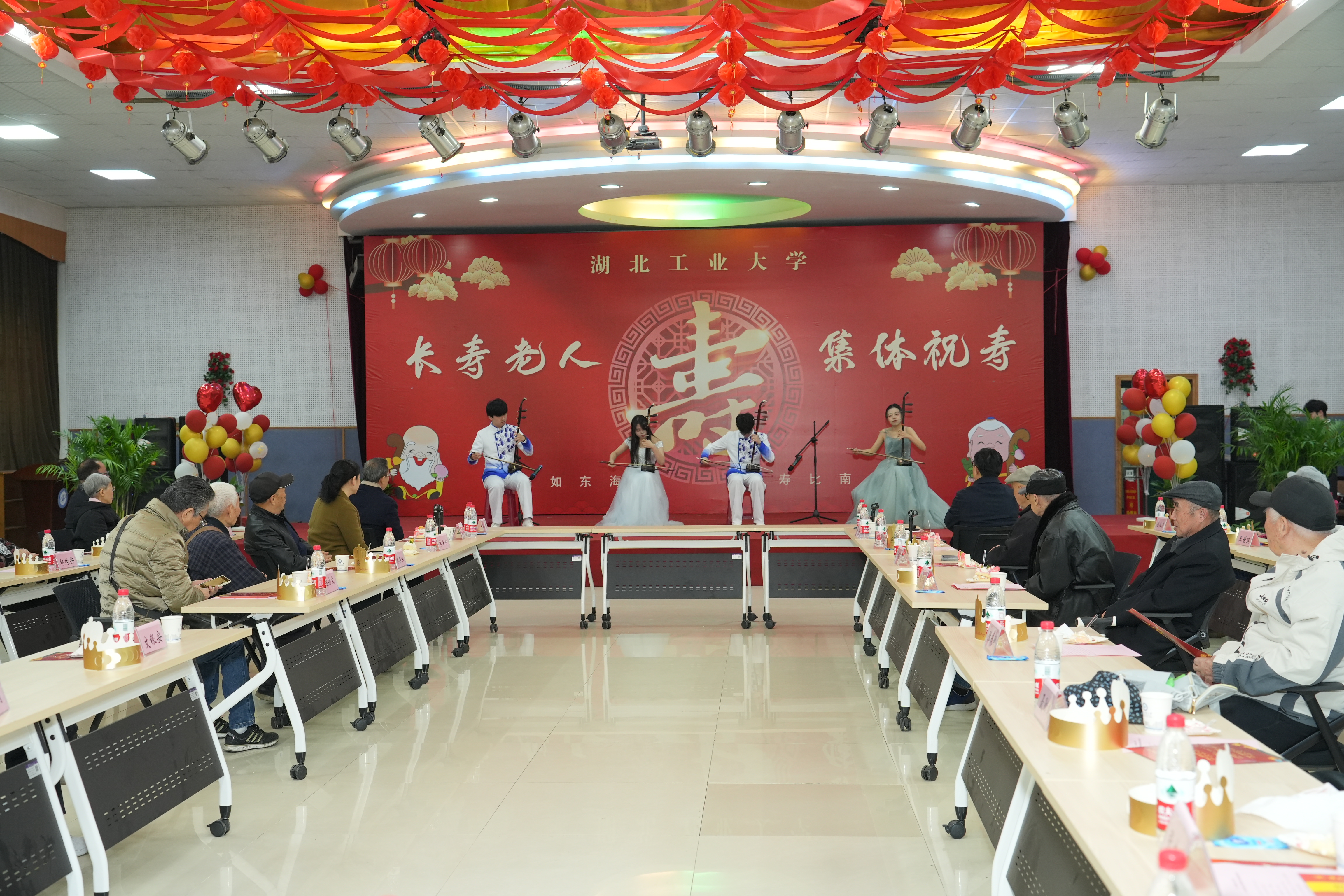 现场,湖北工业大学校领导与寿星代表一起切蛋糕,庆生日,并为在场的每位寿星送上礼金。学校大学生艺术团则为老人们带来了民乐演奏、诗歌朗诵、舞蹈等精彩的演出项目。