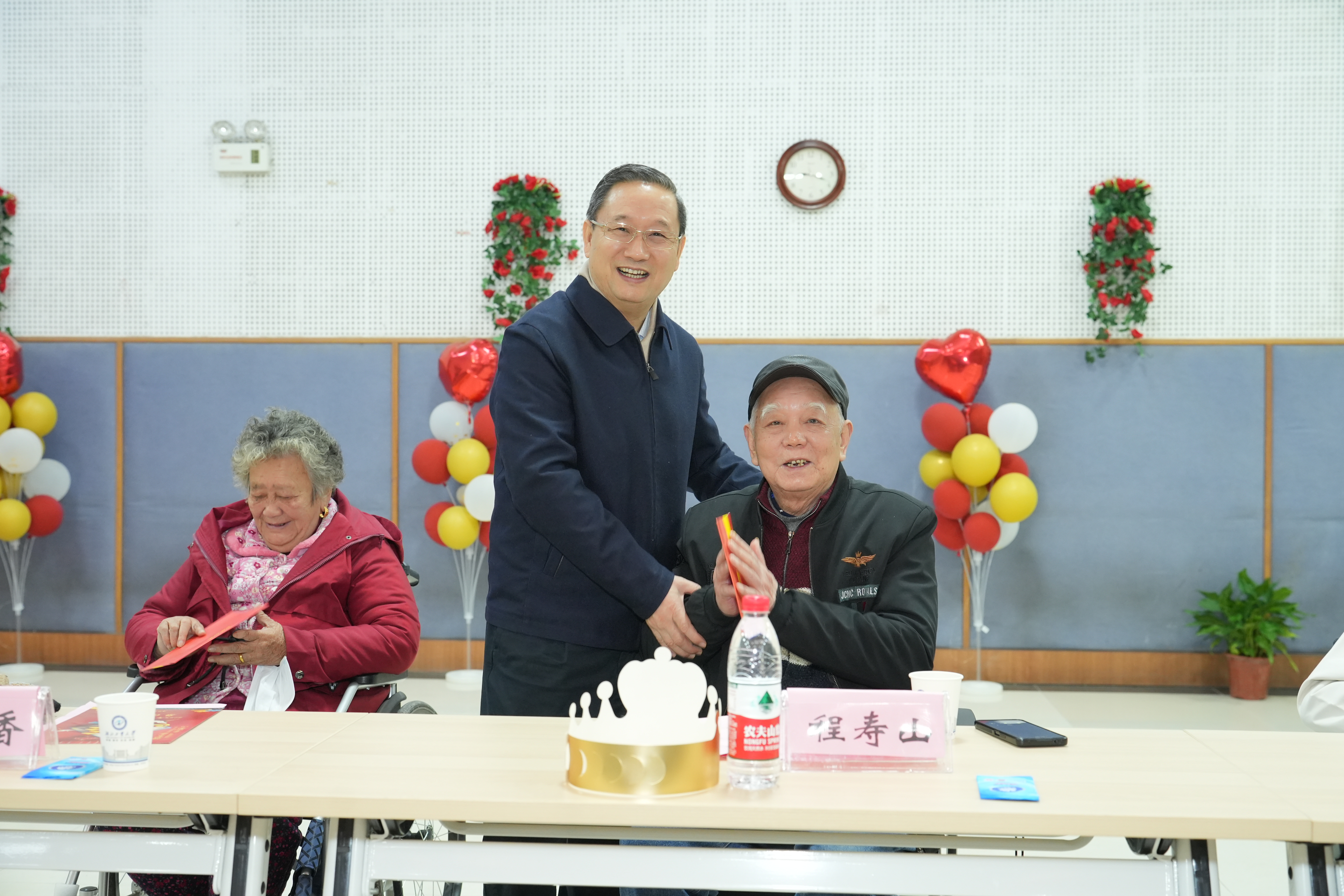 湖北工业大学党委书记彭育园(左)为寿星庆生。