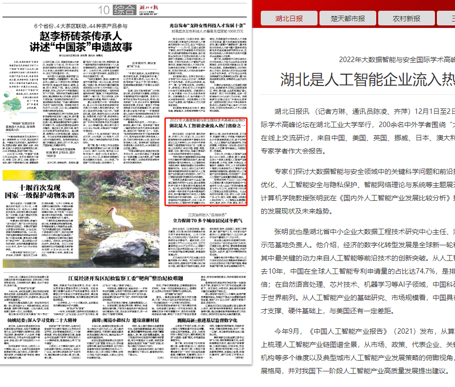 附链接:https://epaper.hubeidaily.net/pc/content/202212/08/content_202934.html【湖北日报】2022年大数据智能与安全国际学术高峰论坛举办 湖北是人工智能企业流入热门省份之一