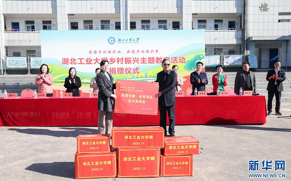 湖北工业大学给红安县将军希望小学捐赠书籍等物资。新华网发 史凡摄