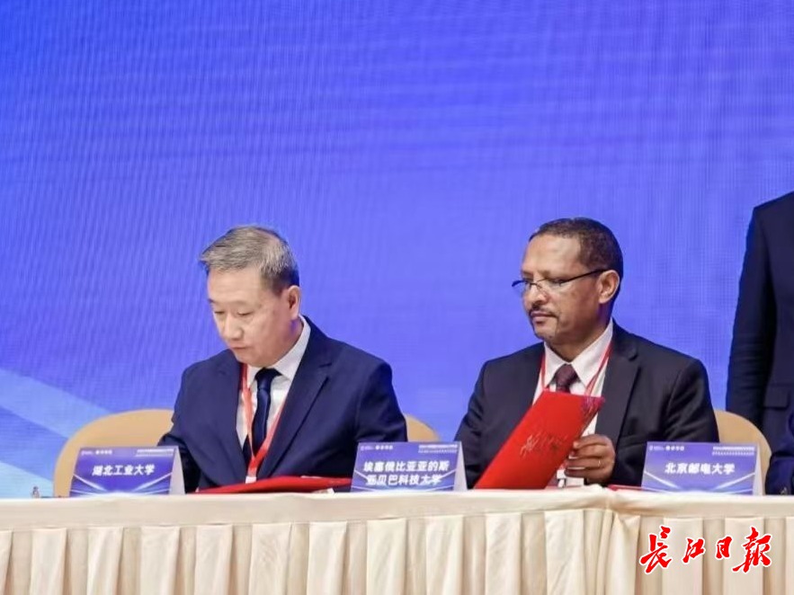 湖北工业大学与亚的斯亚贝巴科技大学签订《共建中非青年创新创业联盟战略合作协议》。记者柯立 摄