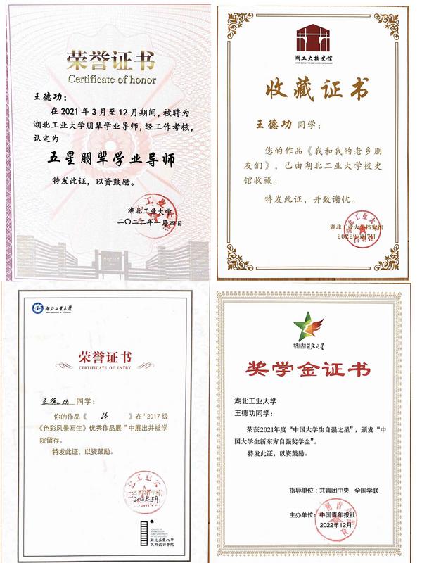 王德功获得的部分荣誉。(照片为湖北工业大学党委宣传部提供)