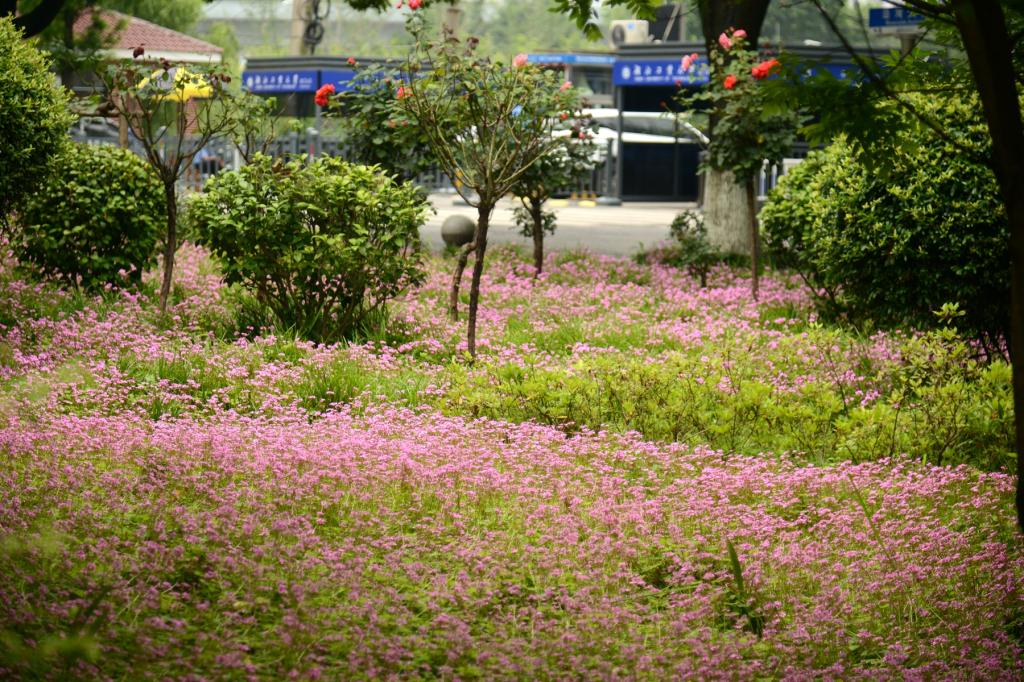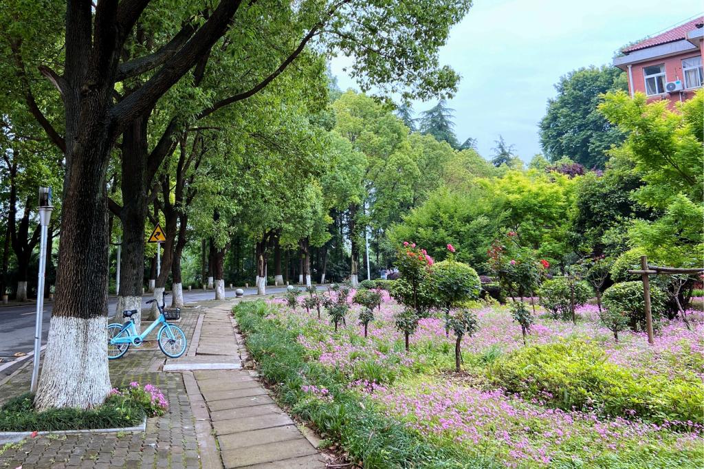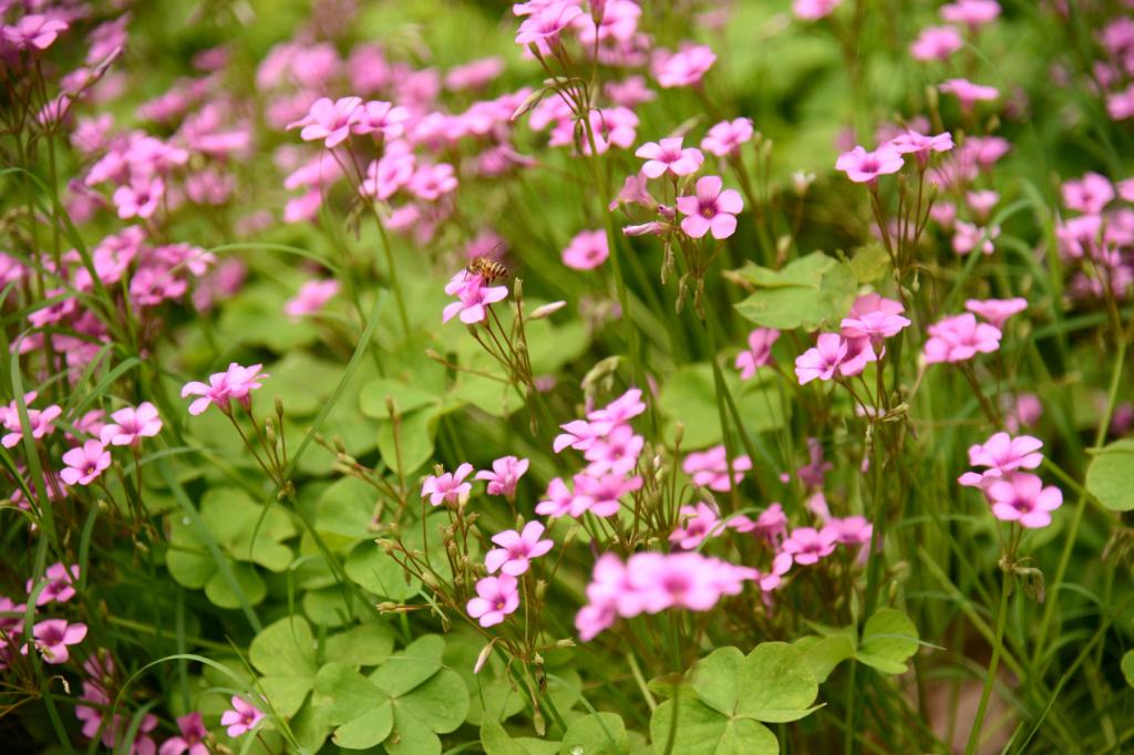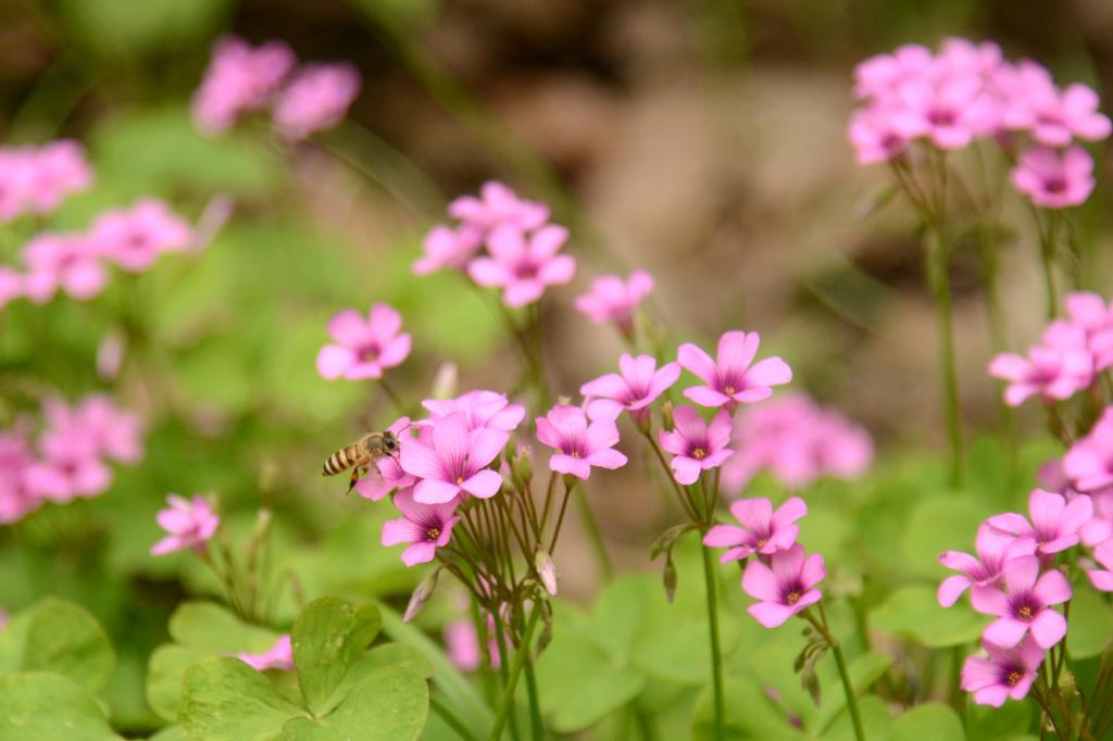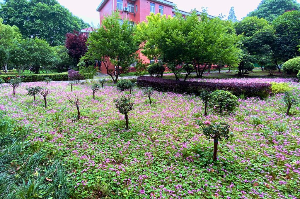 小满时节,红花酢(cù)浆草在校园各处角落竞相开放,紫粉色的花朵吸引无数蜜蜂在花丛间流连。红花酢浆草的五叶花瓣,中间藏着小小的黄色花蕊,随手摘一朵闻闻,一股清新酸涩的青草味便蔓延开来。三五成群的青年学生在花间细语、嬉闹,一片生机盎然。